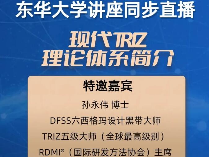各位研发方法爱好者们,大家好,      2023年11月21日周二下午,TRIZ五级大师孙永伟博士将同步直播讲座。欢迎各位参加。      您可通过下图二维码预约本次直播。本次直播面向TRIZ理论基础薄弱或者没有基础的人员,适于初学者参加。目的是让更多人了解TRIZ等先进的研发方法论。...