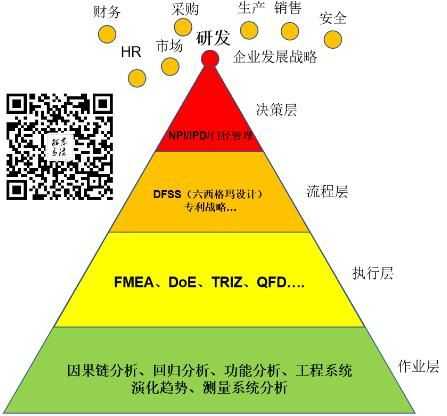 六西格玛设计DFSS-研发方法金字塔之流程层 (研发方法理论体系之三)在上一期中,(研发方法金字塔最高层-研发项目管理 (研发方法理论体系之二)),我们介绍了研发方法金字塔的最上层,即研发项目的决策层,常用的方法论有NPI/IPD/Stage Gate(门径管理),它是研发作为一个企业核心活动的体现,研发需要调动一个企业全部的资源。像前面提到的NPI是管理层的工具,关注的是宏观的决策,所涉及到的不...